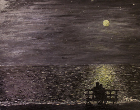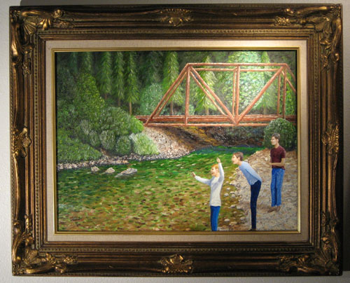 This painting was started in 2011, but got stored in the garage until March 2013. I pulled it out, re-did the sky and water, and made the subjects larger. The painting reflects a couple of things: Even